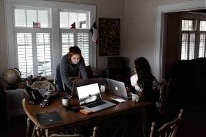 Freelance college students gathered around a table