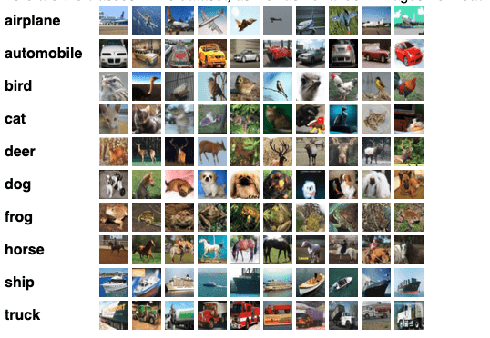 Similar to its sibling, CIFAR-100 ramps up complexity by offering 100 classes and are grouped into 20 superclasses each containing 600 images. Broken down, that’s 500 images per class for training and a hundred for testing. This increase in categories presents a more challenging scenario for models, sharpening the skills of classification algorithms. The dataset’s classes are listed below: