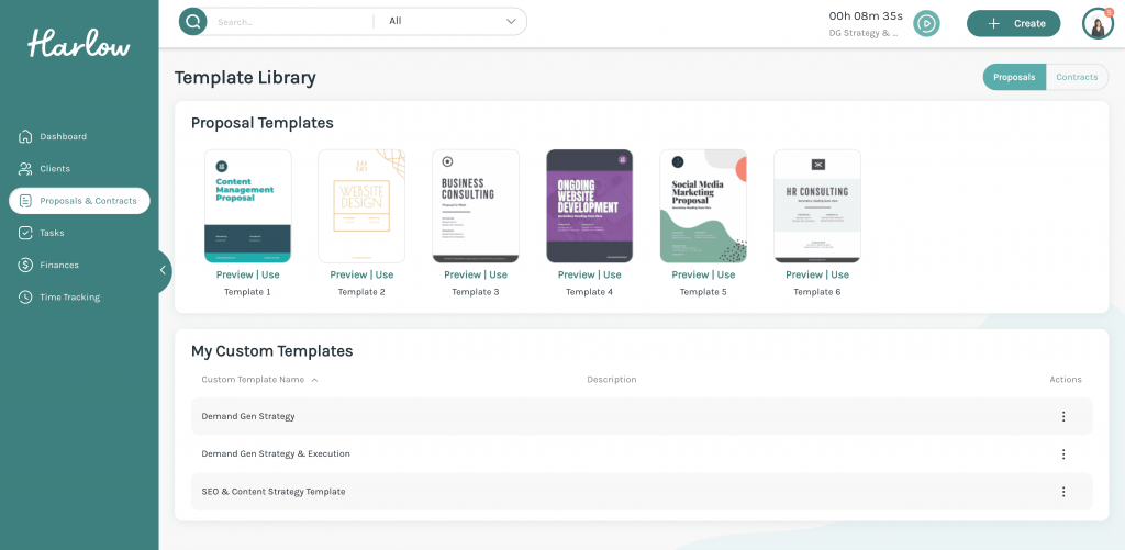 Pro tip: Create a template proposal that houses all of these sections, and then simply tweak each section to fit each new client you’re pitching. Harlow has six pre-built templates that are easy to customize to fit your needs, so you can build a new proposal in minutes.