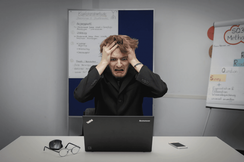 man looking down at computer screen appearing horrified and shocked